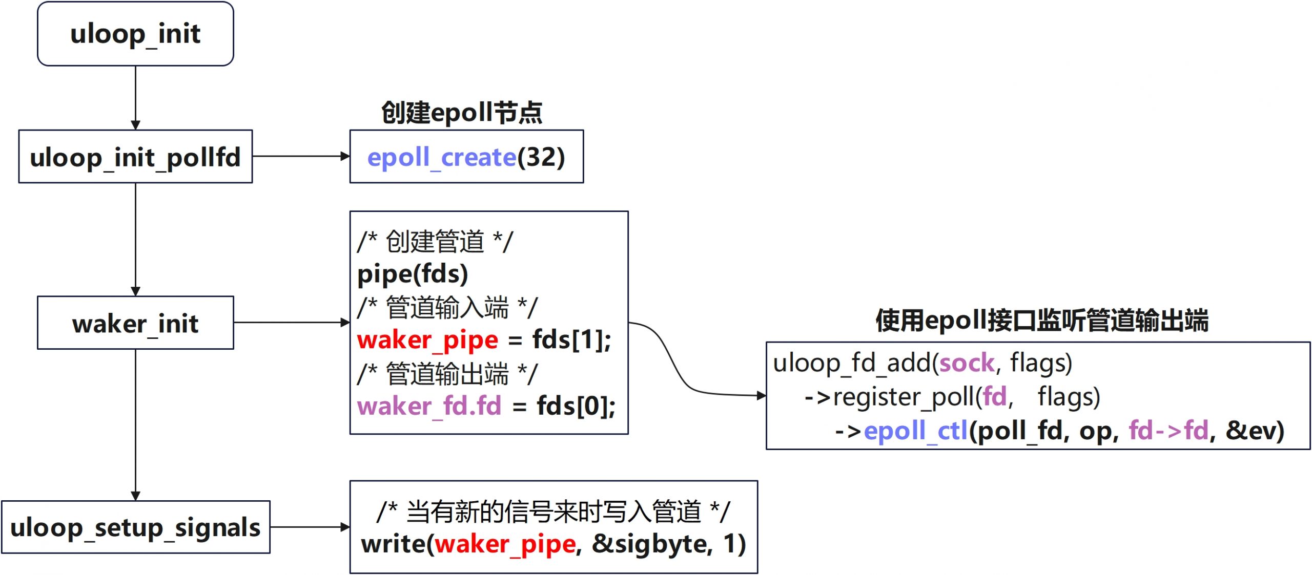 uloop是一个基于epoll建立的轻量级事件循环库,它允许程序以单线程、非阻塞的方式处理多种事件源。主要提供了timeout定时器处理和文件描述符触发事件的监控的能力