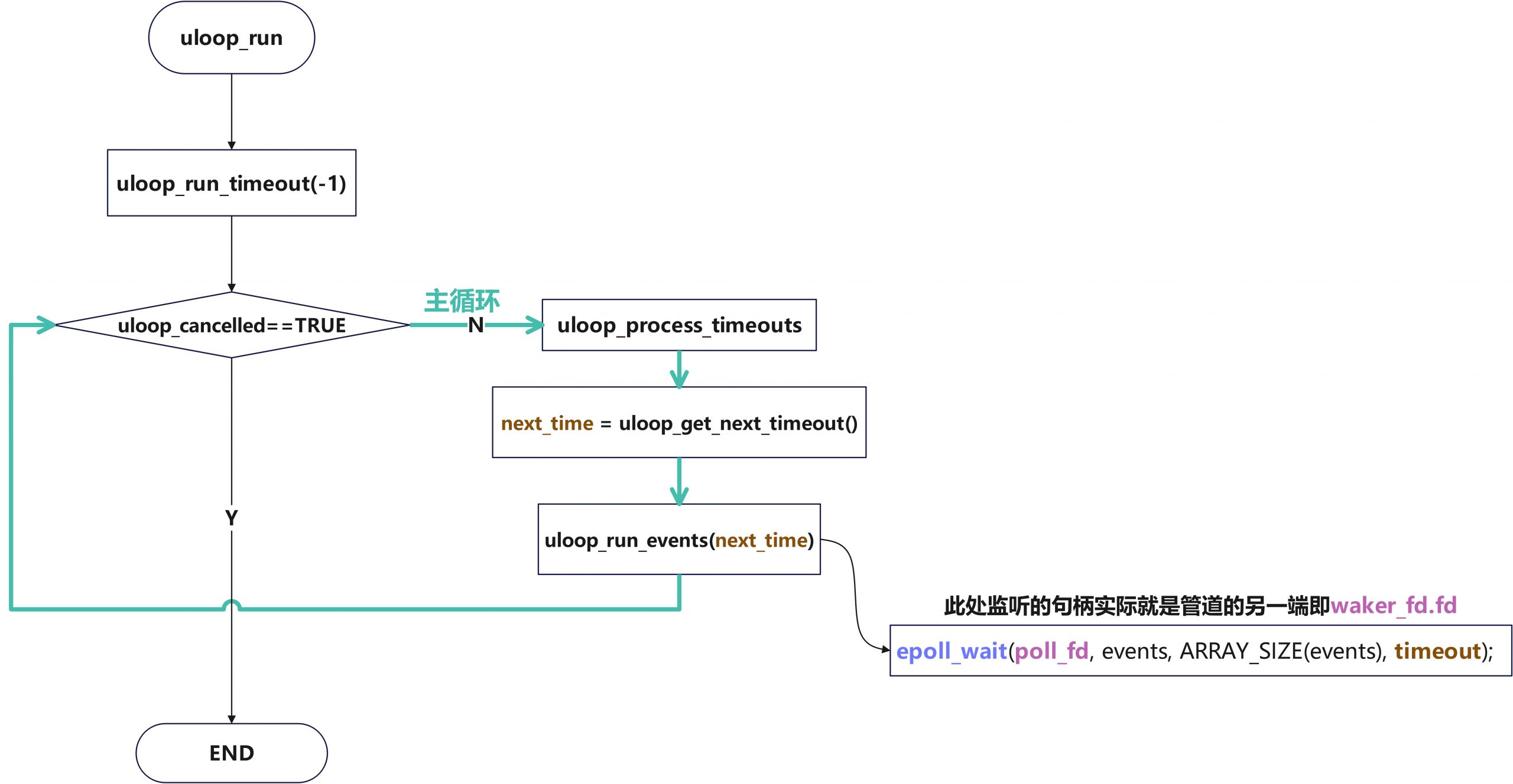 uloop的主循环实际上是在监听句柄的输出端,如果没有外部信号则该管道的输出端会一直不活跃。uloop便是利用了epoll阻塞式的特性来实现循环的等待并且在有外部中断信号时可以优雅的退出这个循环,这里的超时时间便是根据定时器链表中的事件计算,先计算超时事件再设置epoll监听