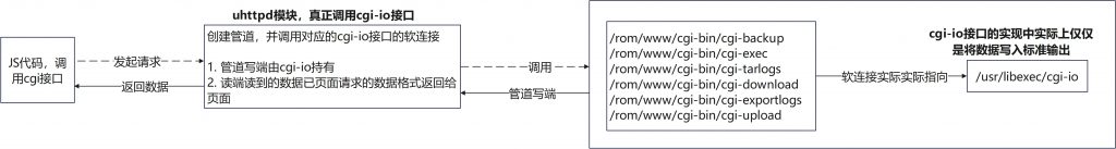 js上创建一个from表单,表单中携带着文件传输的请求 uhttp模块处理这个请求,在/rom/www/cgi-bin目录下去寻找对应的接口- 底层