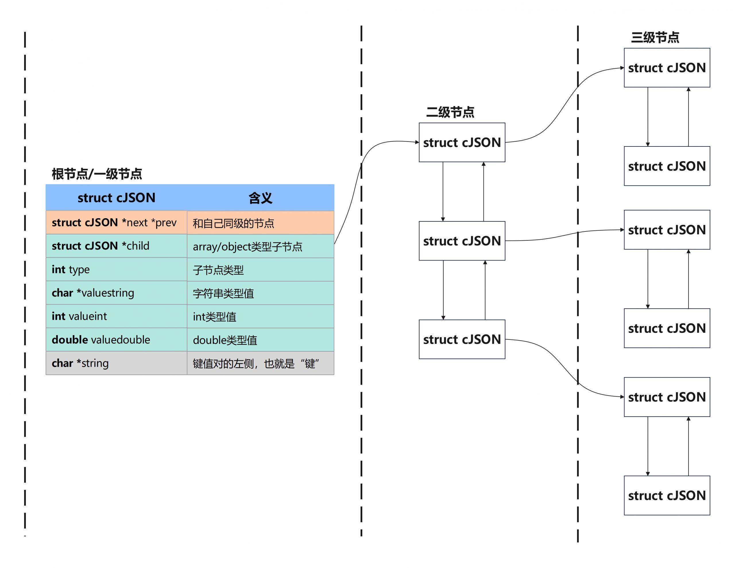 struct cJSON *next,*prev; // 双向链表头节点和尾节点