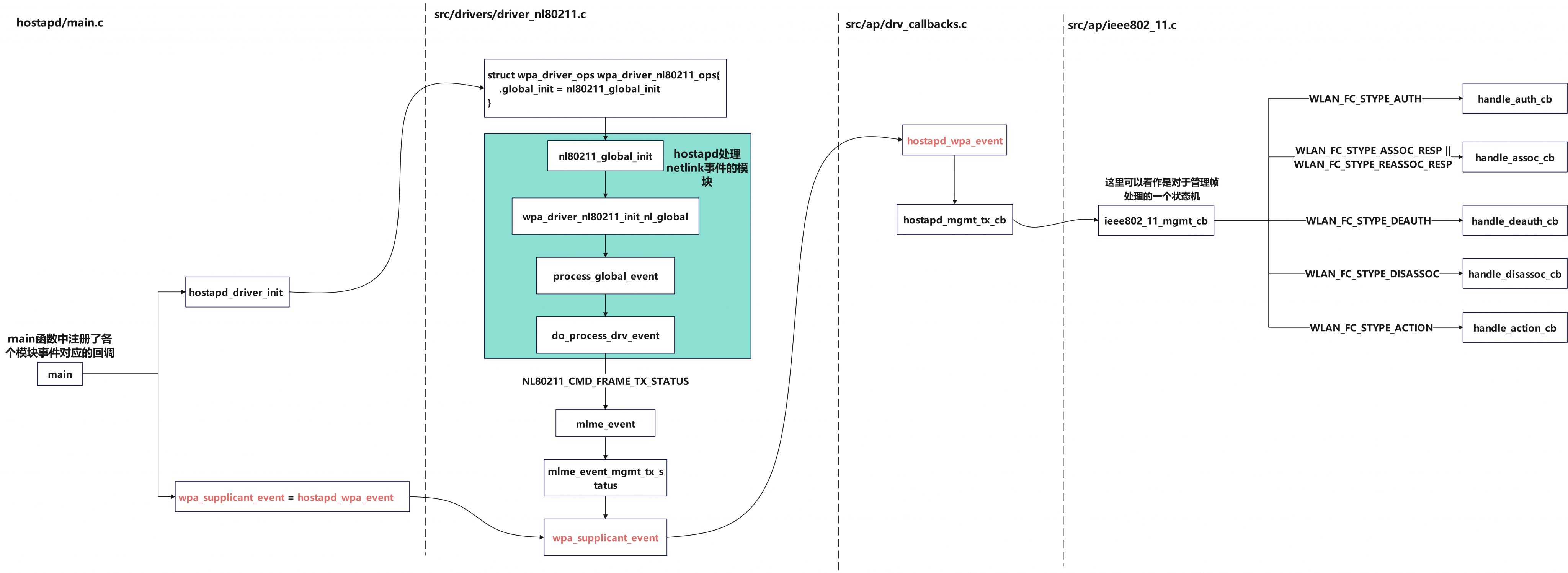 从代码调用栈上来是wifi连接后触发了hostapd中对于管理帧处理的流程,这段逻辑开始来自netlink事件上报,然后触发hostapd中的状态机中,接着状态机处理管理帧报文时打印了这些日志