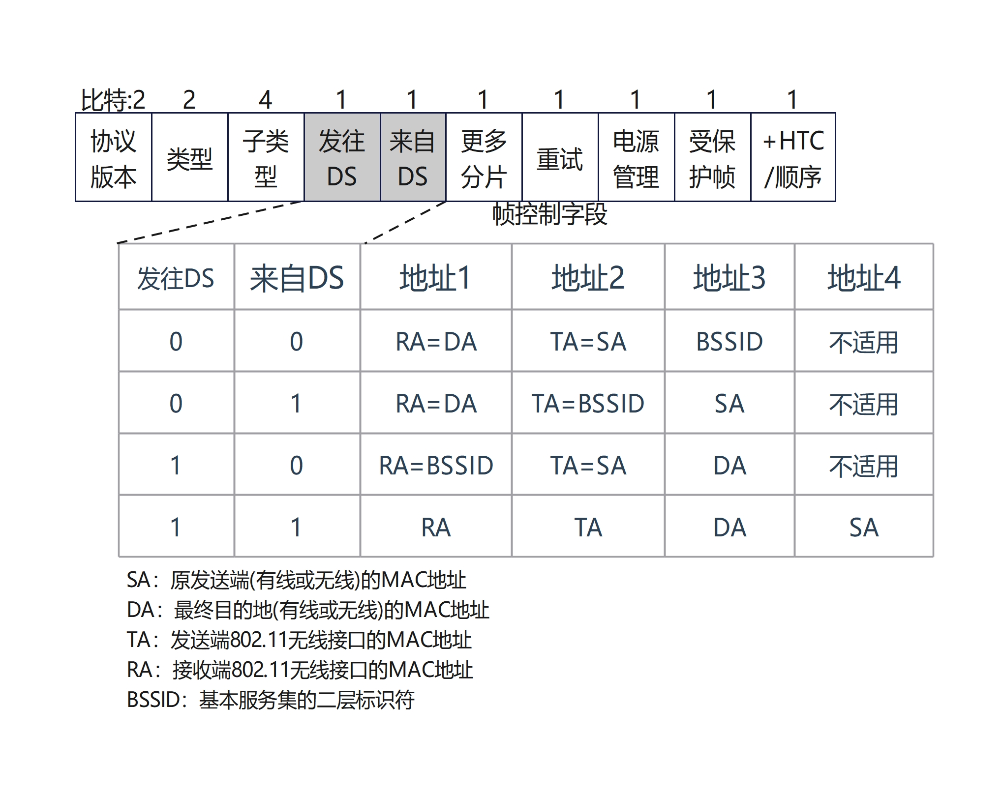 当发往DS子字段、来自DS子字段与4个MAC地址一起使用时,两个子字段的定义将发生变化。一般来说,地址1字段始终用作接收机地址(RA),但也可能另有定义;地址2字段始终用作发射机地址(TA),但同样可能另有定义;地址3字段通常提供附加的MAC地址信息;地址4字段仅在无线分布系统中使用