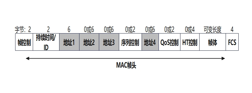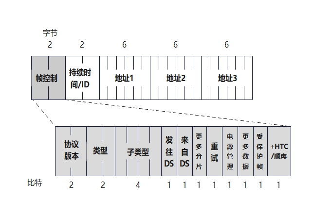 如图所示,MAC帧头的前两个字节是帧控制字段,由协议版本、类型、子类型、发往DS、来自DS、更多分片、重试、电源管理、更多数据、受保护帧、+HTC/顺序共11个字段构成