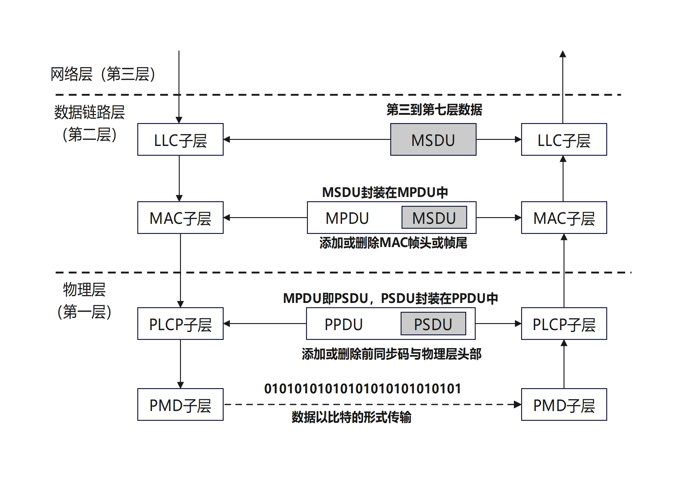 数据链路层分为两个子层,上层是802.2逻辑链路控制(LLC)子层,下层是介质访问控制(MAC)子层。所有802网络具有相同的LLC子层结构,但并非所有802网络都使用LLC子层,802.11标准定义的无线局域网通信位于MAC子层