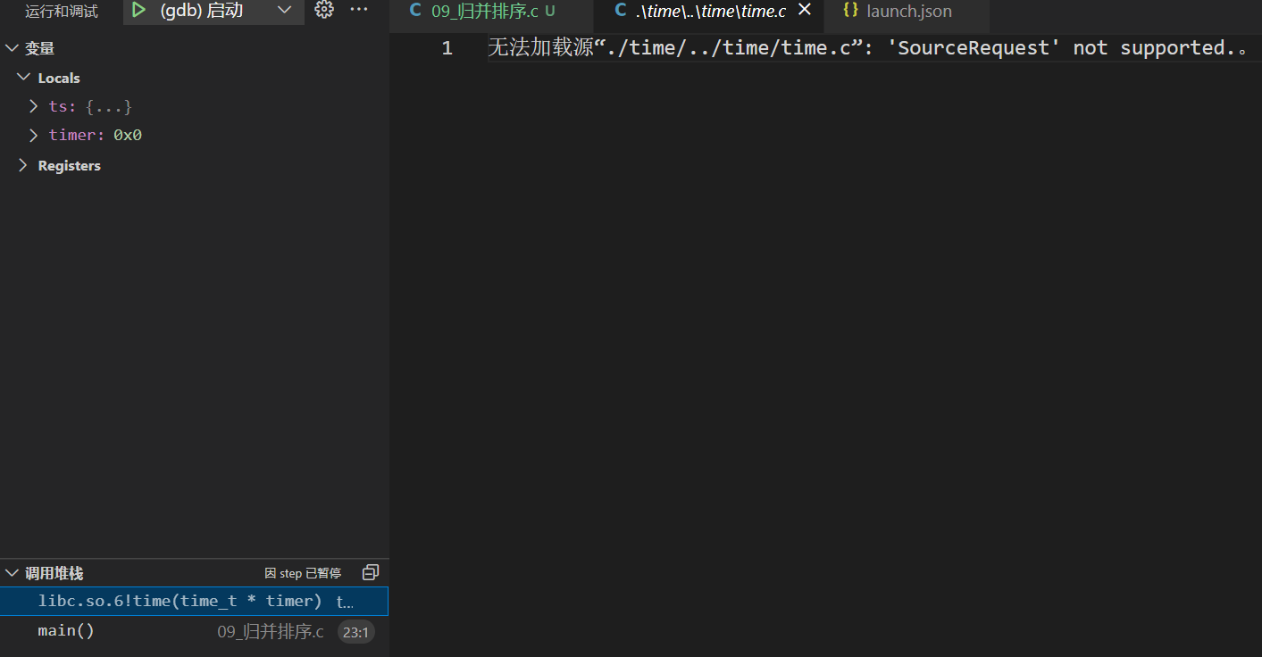 此时代码中的time(NULL)函数指向libc.so.6库,由于在GDB配置路径中不存在对应版本的glibc源代码所以无法正常跳转至函数定义处