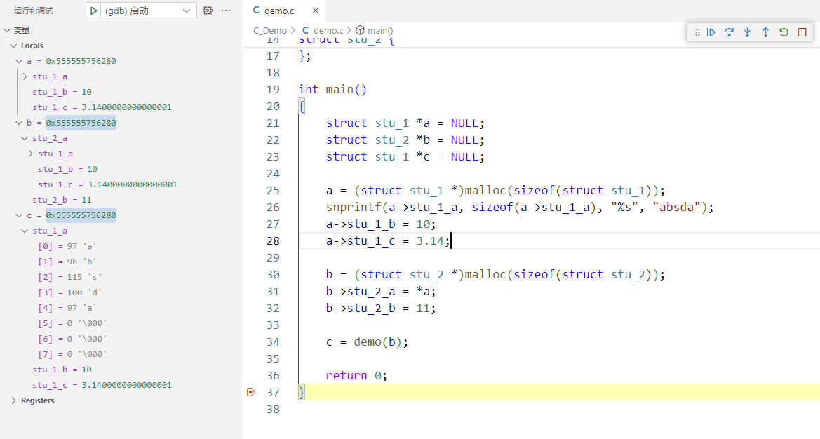 通过GDB可以直观的看到,其内存分布情况。可以看到,这种“继承”方法获取的地址实际上也是指向了“父结构体”的头部,只是结构体类型不同可以读取到的内存数据也就不同